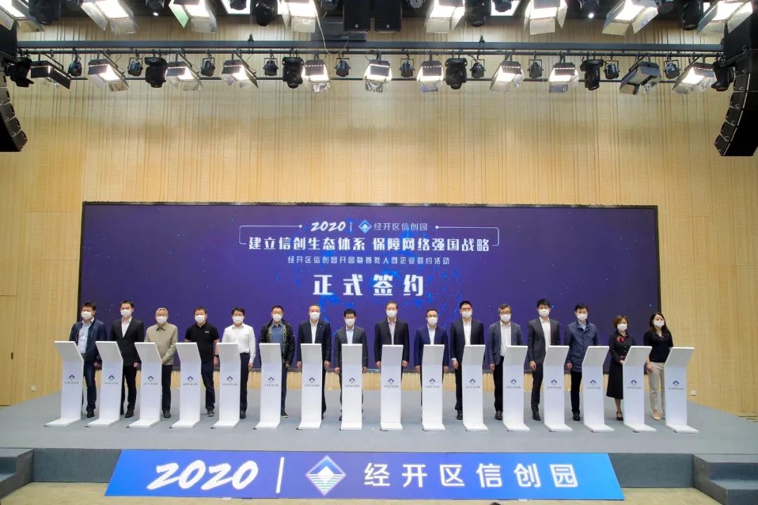 2020年5月8日,“建立信创生态体系,保障网络强国战略”——国家网络安全产业园经开区信创园开园暨首批入园企业签约活动顺利举行。神州信息、华为、龙芯、统信、浪潮等30家信创领域的“四梁八柱”企业一起签约入驻信创园,为北京经开区在“新基建”建设方面再添新动能。现场,工业和信息化部副部长陈肇雄,北京市委常委、副市长殷勇出席并致辞。神州信息董事长郭为受邀出席,并代表神州信息签约。