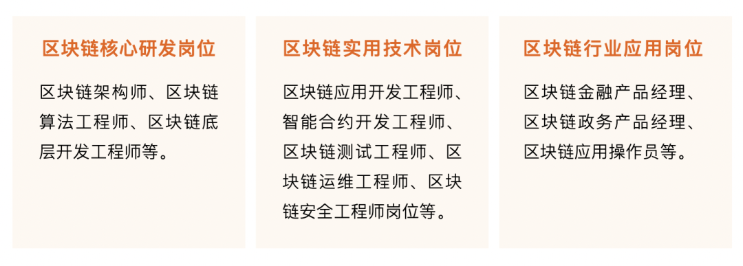 2. 区块链实用技术岗位:区块链应用开发工程师、智能合约开发工程师、区块链测试工程师、区块链运维工程师、区块链安全工程师岗位等。